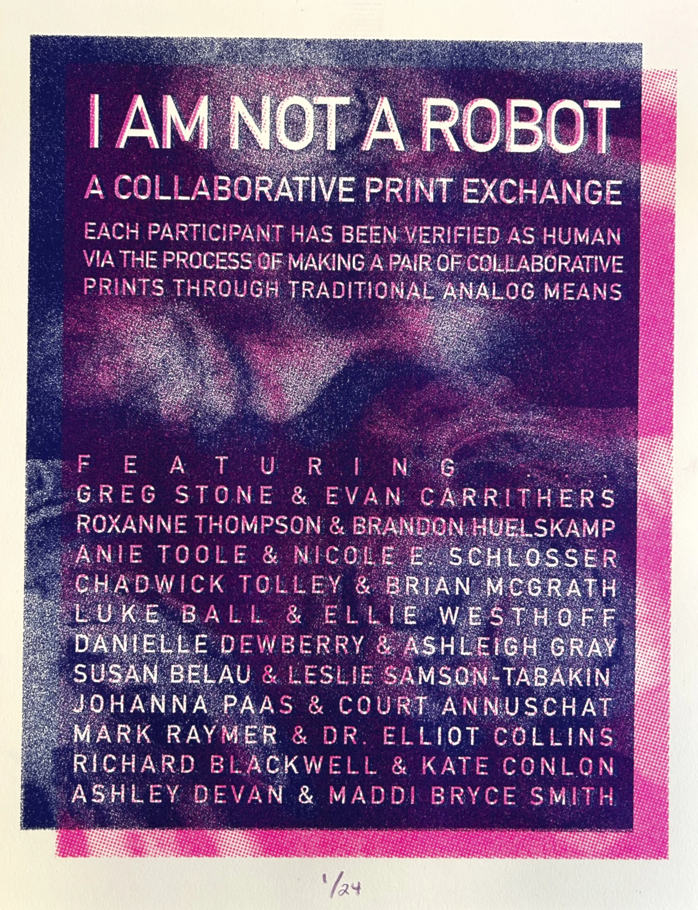 I Am Not A Robot was organized by Greg Stone and Evan Carrithers for Southern Graphics Council International 2024 (SGCI).